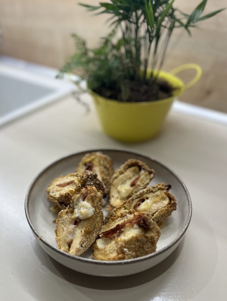 • Lorsque chaque morceau est bien pané, passez à la cuisson : au AirFryer = placez les sur une feuilles de papier cuisson pendant environ 6min de chaque côtés à 200°C, OU à la poêle puis au four = faîtes les griller à la poêle avec suffisamment d’huile d’olive puis passez les au four pour qu’ils cuisent bien.