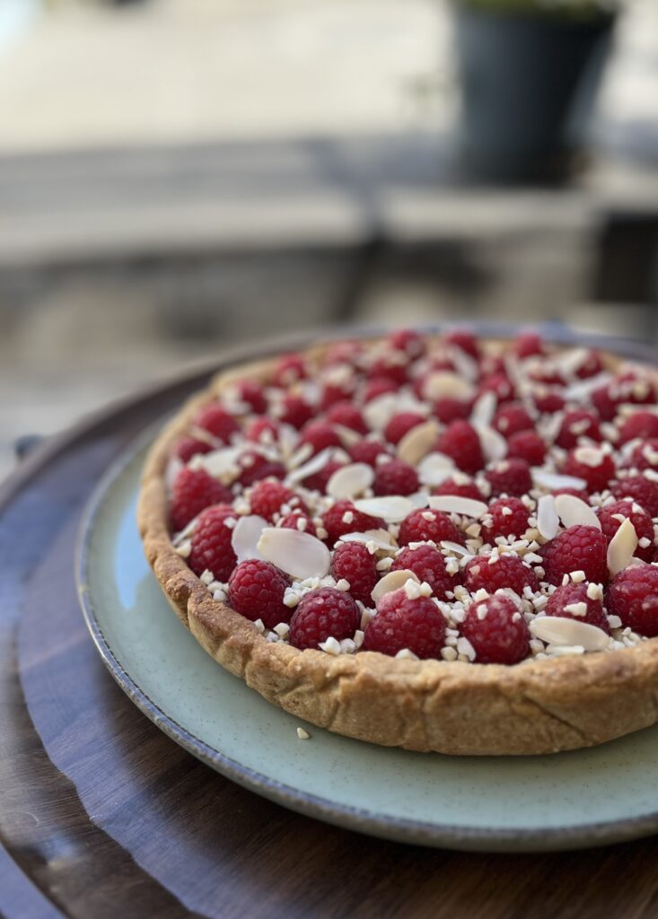 - Laissez refroidir puis placez environ 250g de framboises fraîches sur la crème d’amandes ainsi qu’un filet de sirop d’agave et des amandes effilées/concassées.